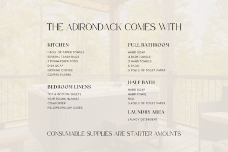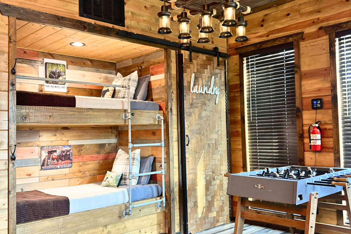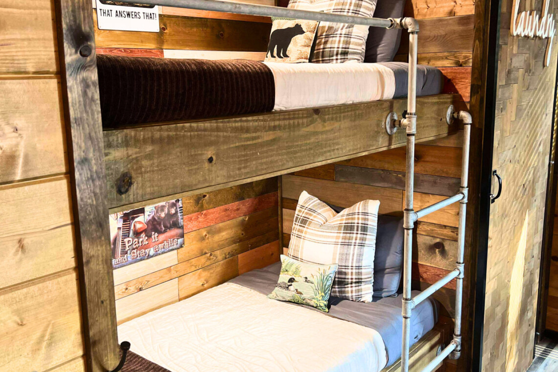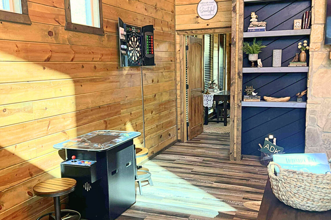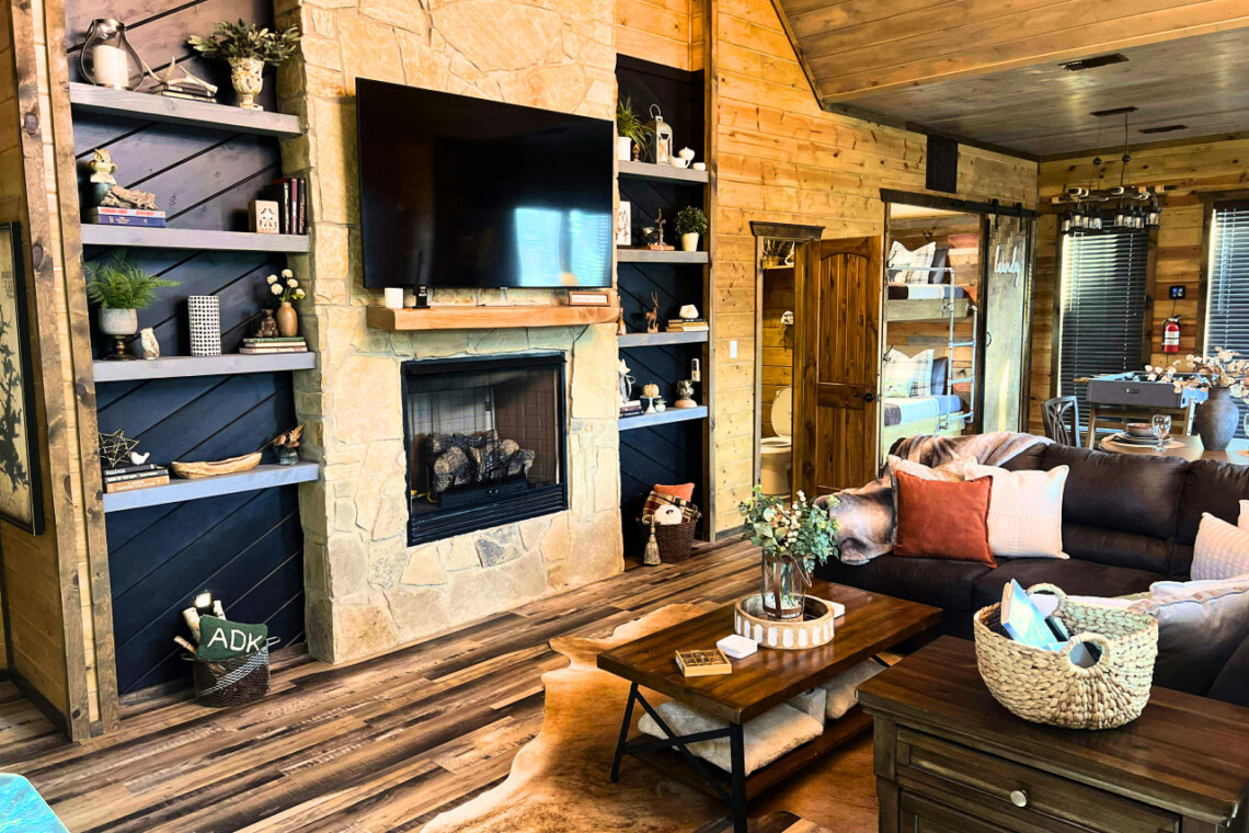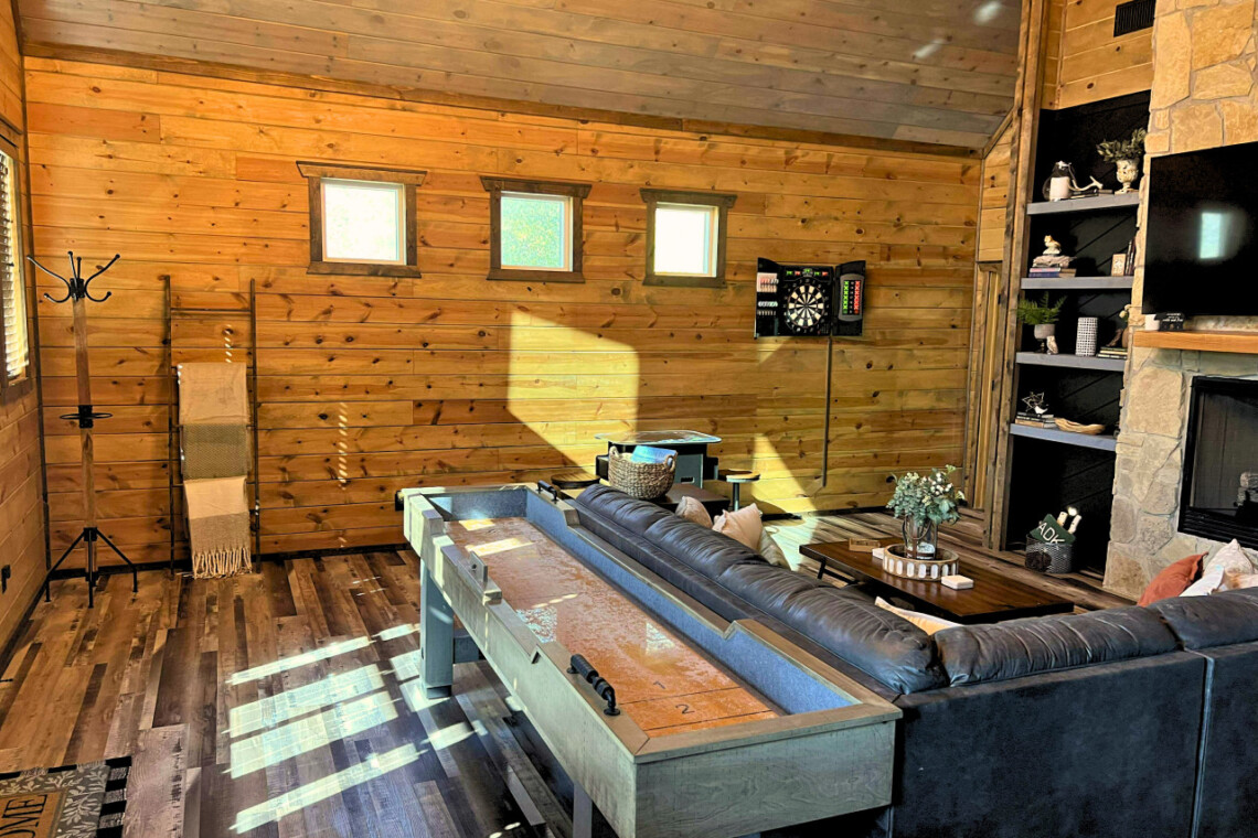 With 1,350 sq. ft. of open-concept living, vaulted ceilings, and large windows framing the natural beauty of the mountains, The Adirondack is a dream escape for nature lovers and luxury seekers alike. Whether you’re enjoying a glass of wine by the fireplace, soaking in the hot tub, or playing a round of shuffleboard, every detail has been curated for your comfort.