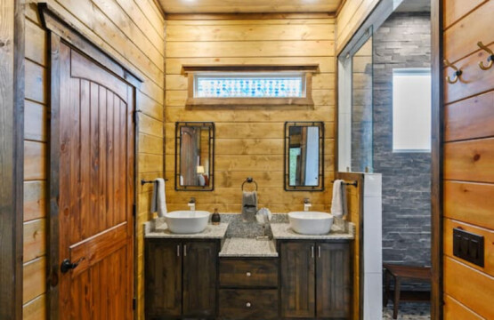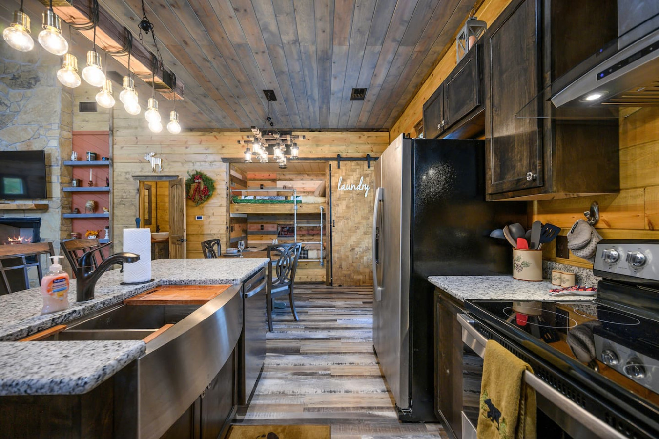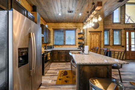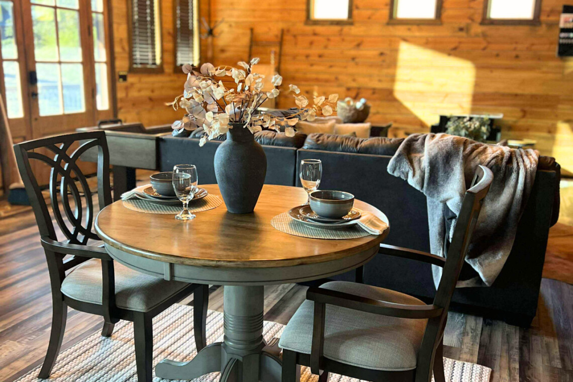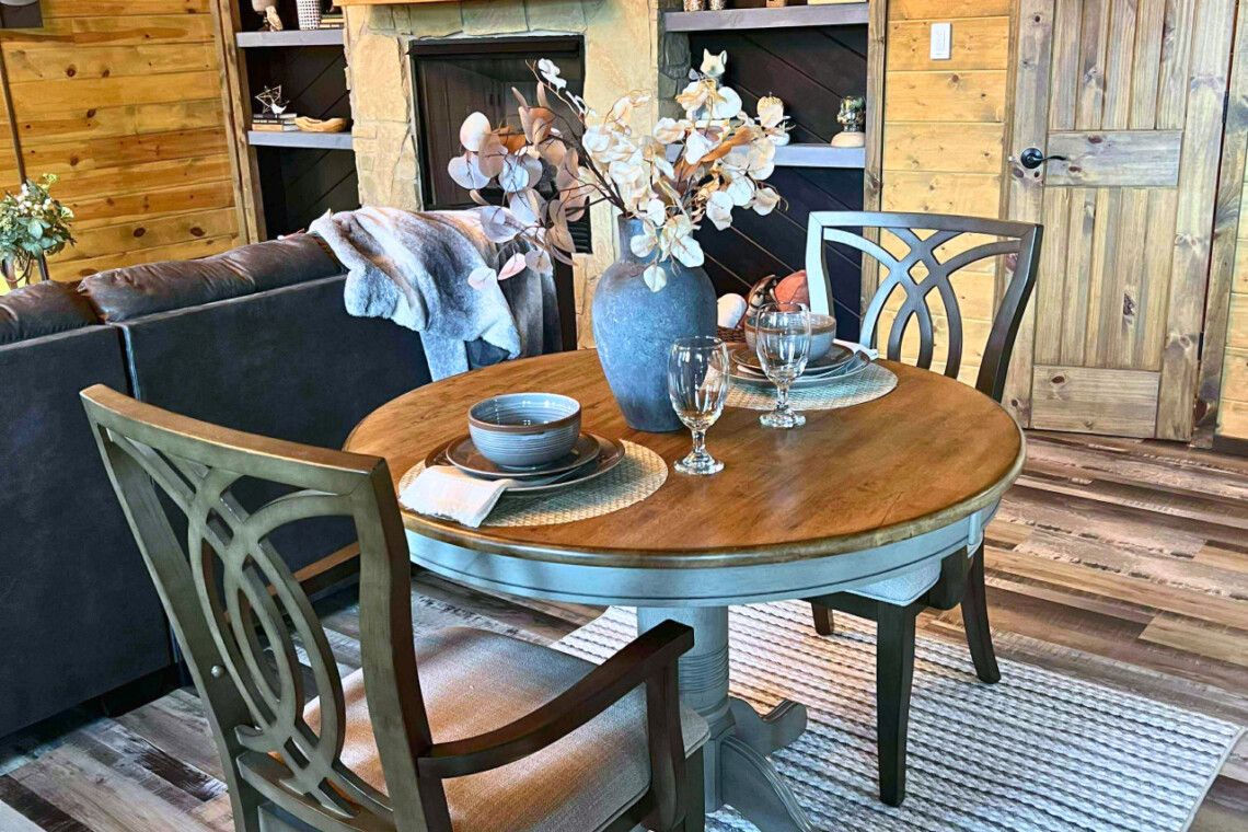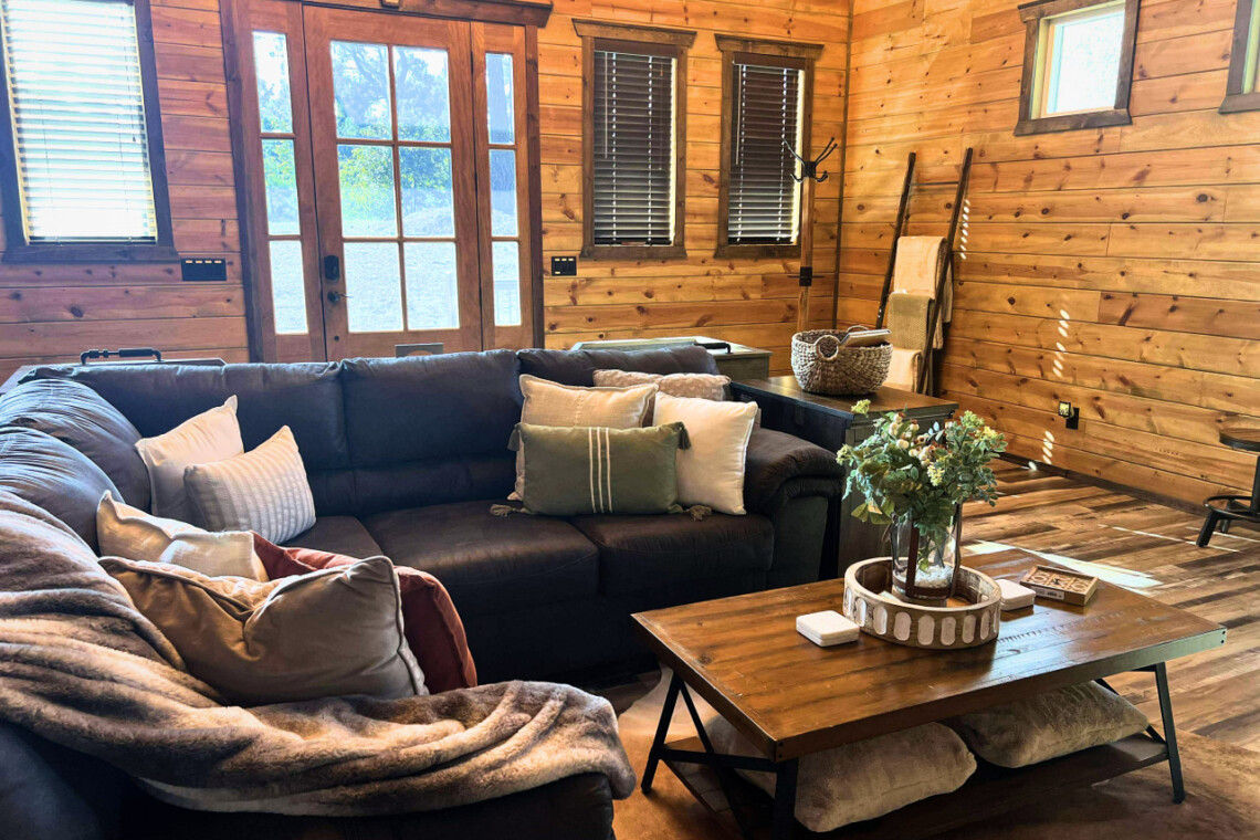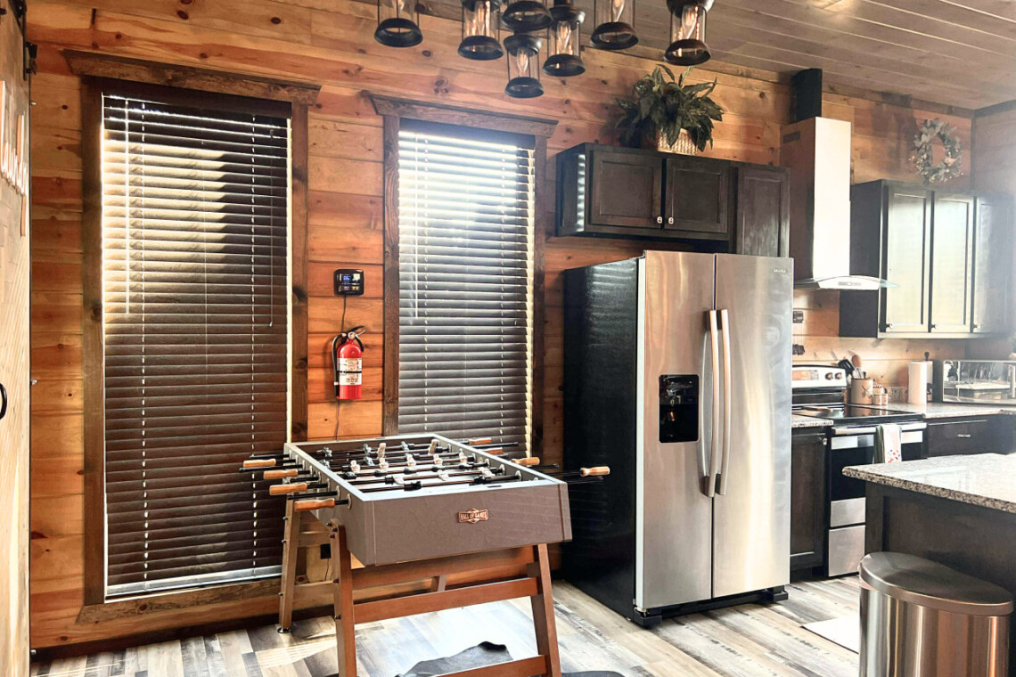 With 1,350 sq. ft. of open-concept living, vaulted ceilings, and large windows framing the natural beauty of the mountains, The Adirondack is a dream escape for nature lovers and luxury seekers alike. Whether you’re enjoying a glass of wine by the fireplace, soaking in the hot tub, or playing a round of shuffleboard, every detail has been curated for your comfort.