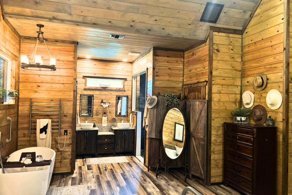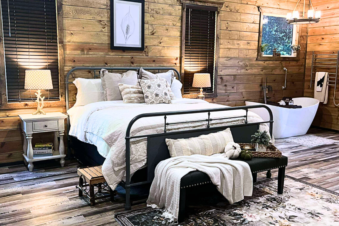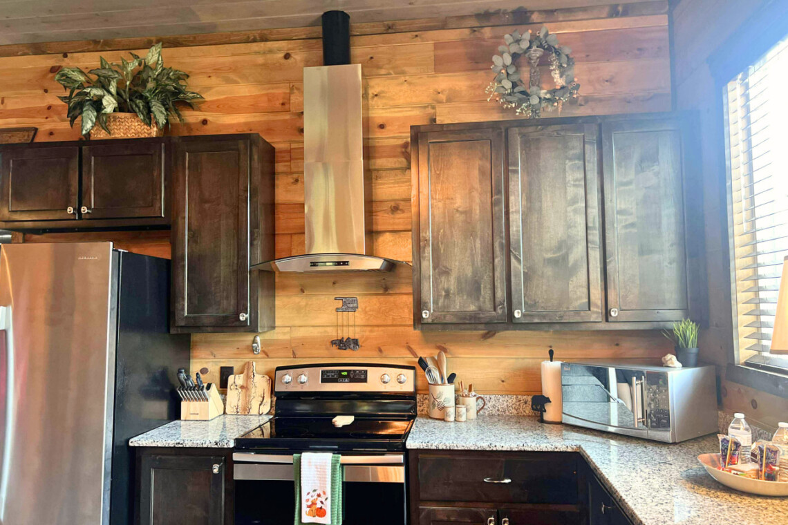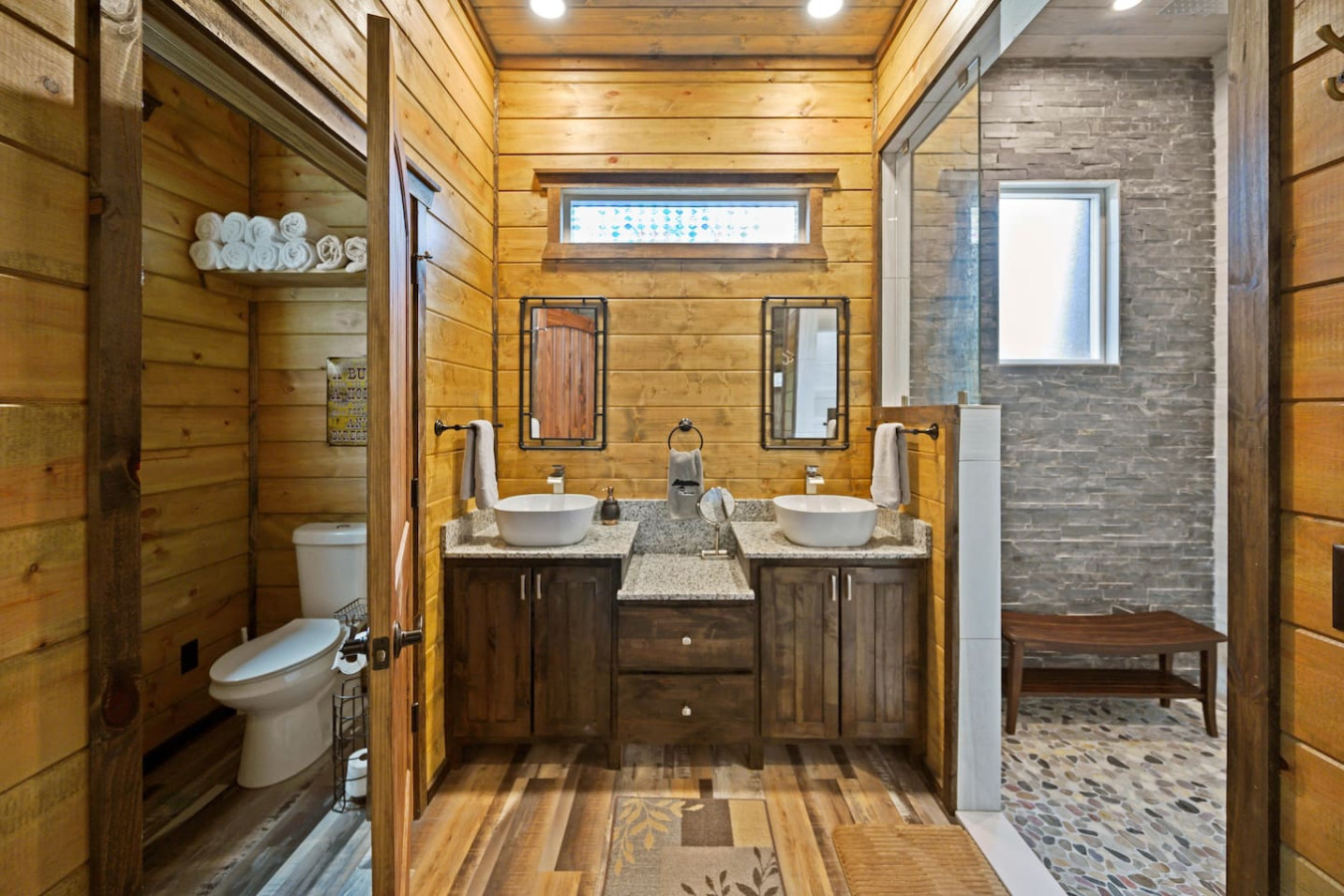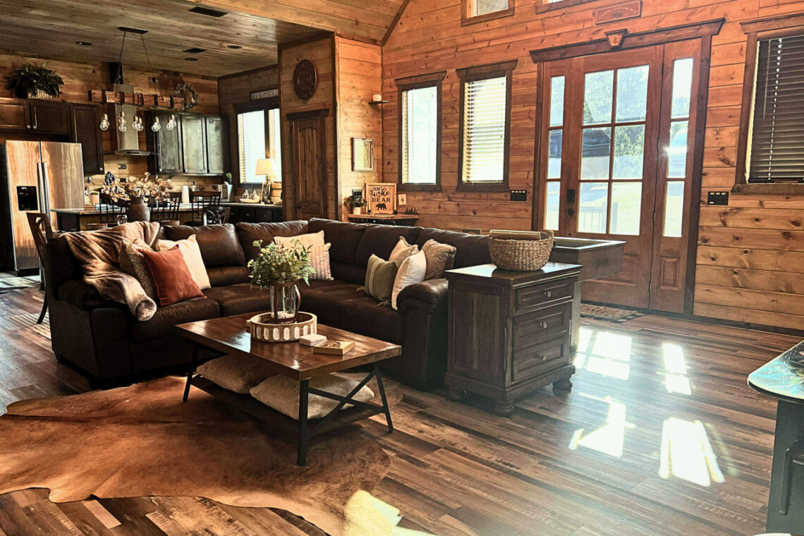 With 1,350 sq. ft. of open-concept living, vaulted ceilings, and large windows framing the natural beauty of the mountains, The Adirondack is a dream escape for nature lovers and luxury seekers alike. Whether you’re enjoying a glass of wine by the fireplace, soaking in the hot tub, or playing a round of shuffleboard, every detail has been curated for your comfort.